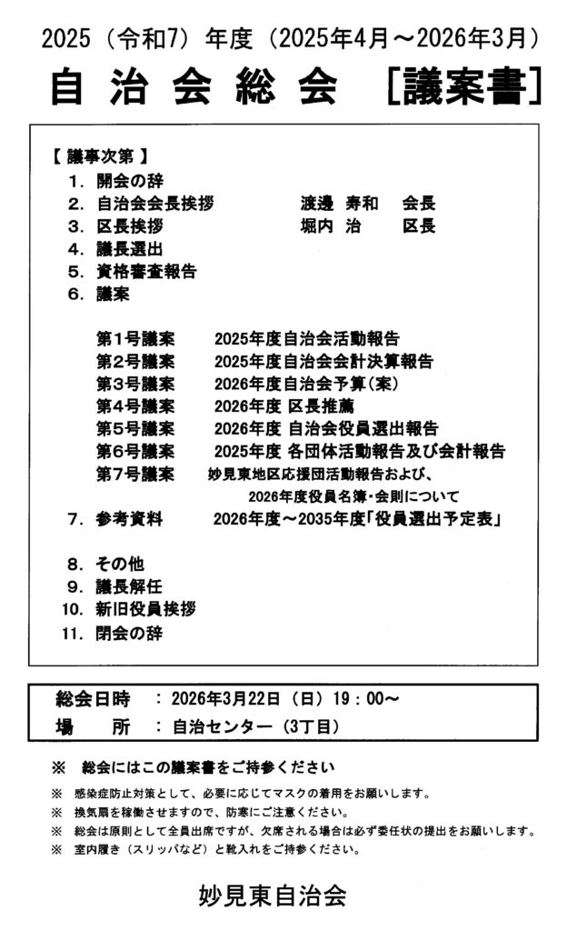 - 自治会総会 3/22(日)19:00~自治センター