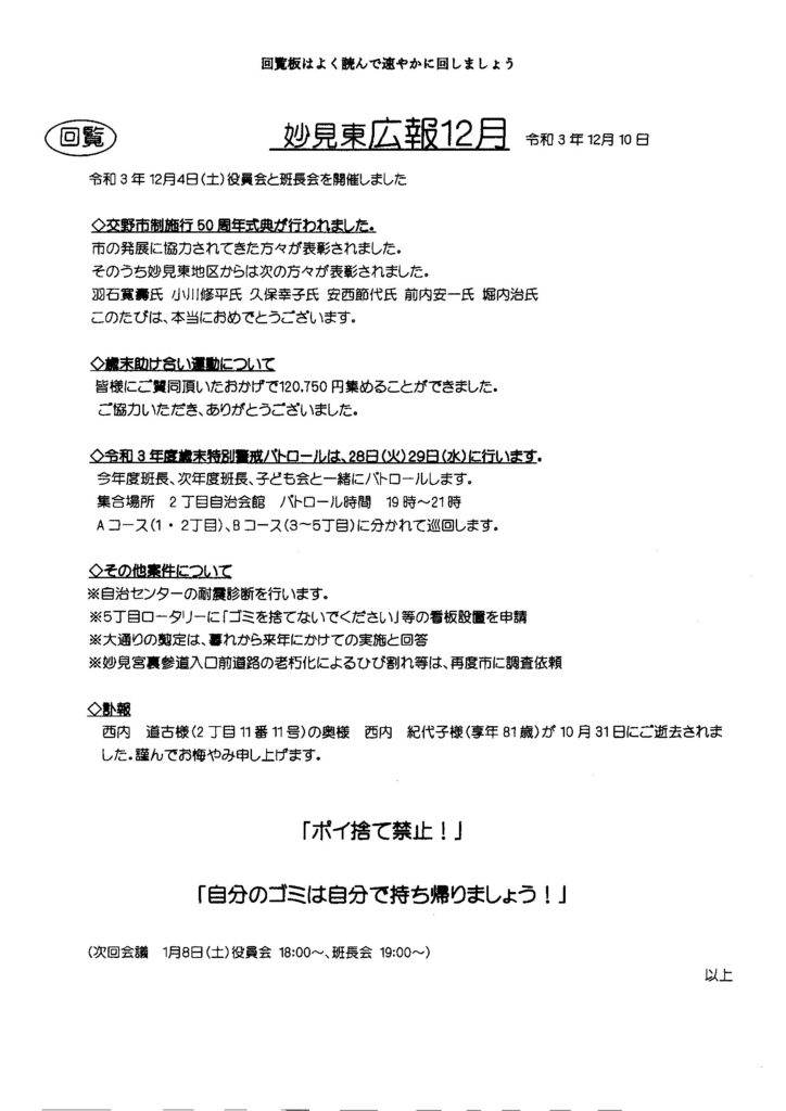 妙見東広報と回覧 令和3年12月10日 2021.12.11 目次 年末年始のゴミの収集及び受付について第91回 映画会 令和3年12月22日 13:00~ 自治センタースマホ講習 開催日時のご案内 自治センター共生型サロンと喫茶コーナー 開催日時のご案内 自治センターがけ地近接等危険住宅移転事業補助金のご案内交番だより 令和3年12月号交番だより 令和3年12月 臨時号枚方税務署からのお願い若年者のための就労相談職業適性検査のご案内第三中学校区における市立小中学校の適正配置等に関する懇談会だより 第3号 年末年始のゴミの収集及び受付について 第91回 映画会 令和3年12月22日 13:00~ 自治センター スマホ講習 開催日時のご案内 自治センター 共生型サロンと喫茶コーナー 開催日時のご案内 自治センター がけ地近接等危険住宅移転事業補助金のご案内 交番だより 令和3年12月号 交番だより 令和3年12月 臨時号 枚方税務署からのお願い 若年者のための就労相談 職業適性検査のご案内 第三中学校区における市立小中学校の適正配置等に関する懇談会だより 第3号