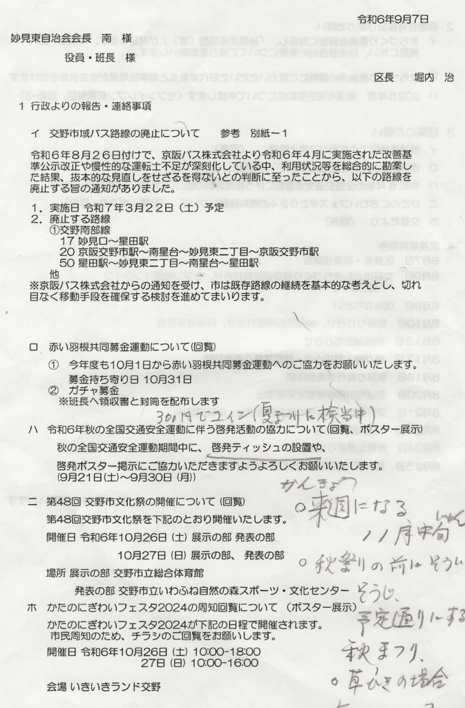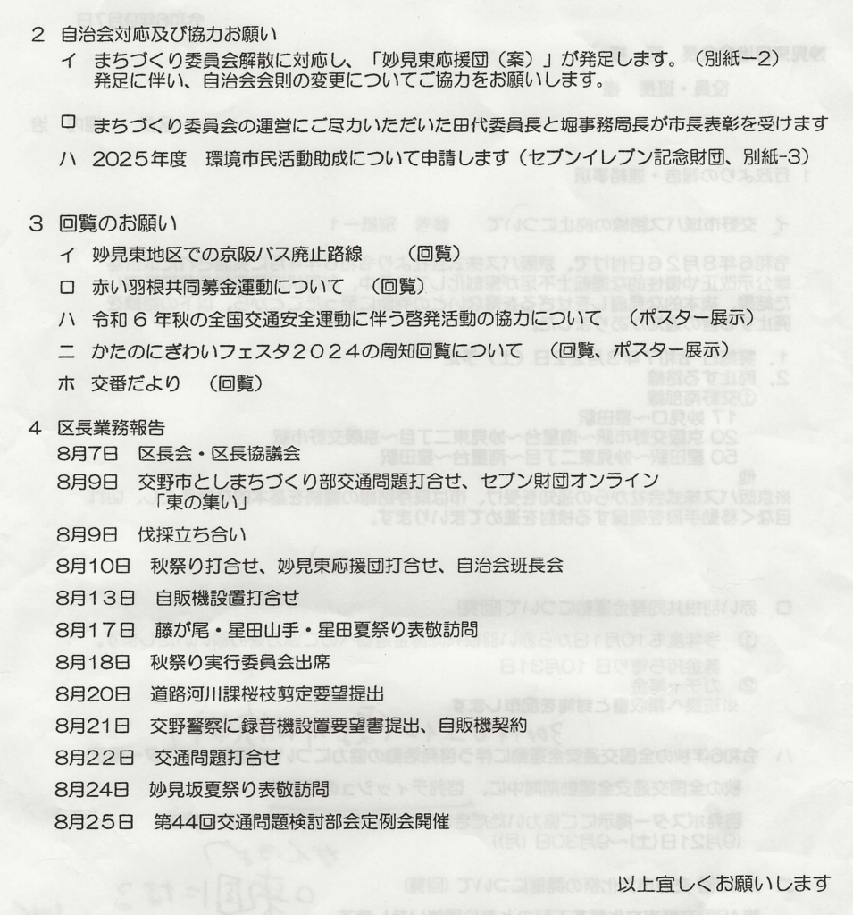 区長より報告・連絡事項 令和6年9月7日