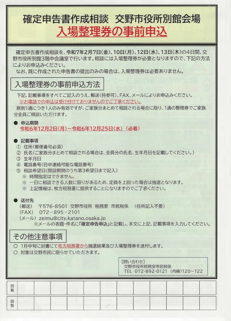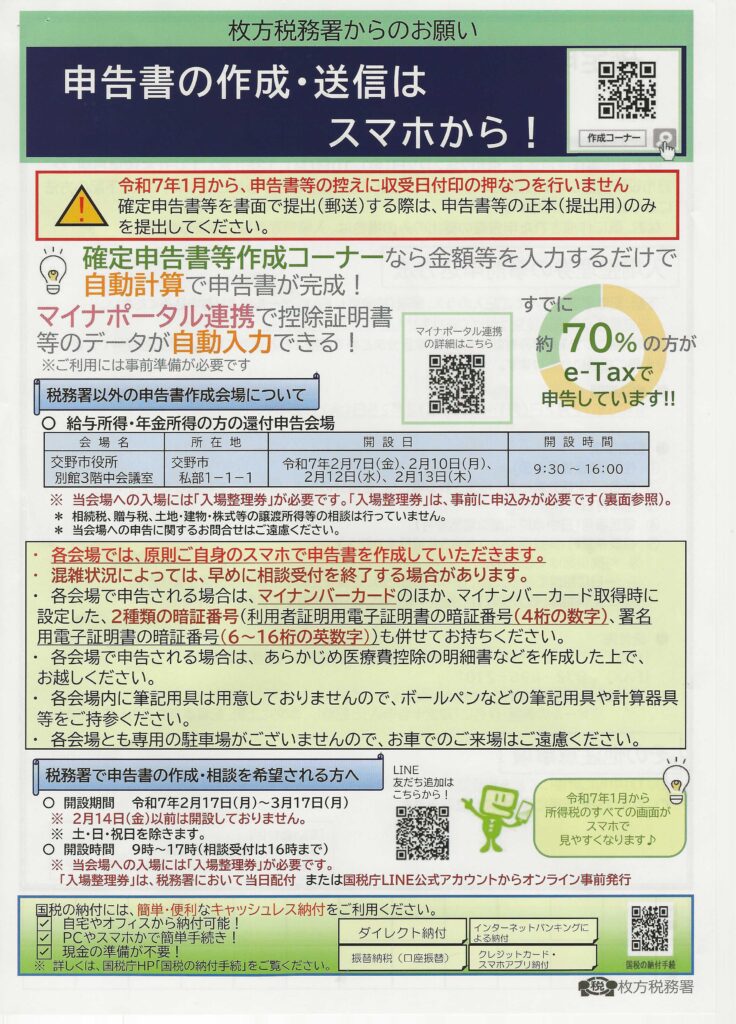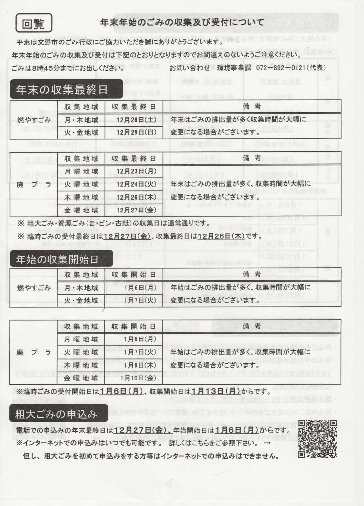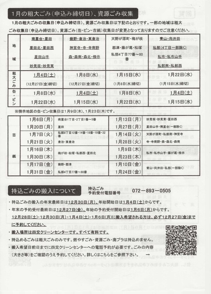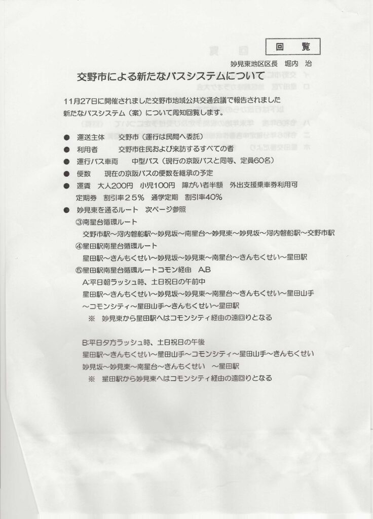 広報と回覧 令和6年12月15日 2024.12.192026.01.13 水彩画:玉田幸子 妙見東2丁目 「能勢の晩秋」 スケッチ場所:大阪府能勢町 目次 交野市による新たなバスシステムについてコミュニティーバス運行計画(案)星田7地区親睦カラオケ大会年末年始のゴミの収集及び受付について確定申告書作成相談 枚方税務署星田交番だより 令和6年12月 交野警察署 交野市による新たなバスシステムについて コミュニティーバス運行計画(案) 星田7地区親睦カラオケ大会 年末年始のゴミの収集及び受付について 確定申告書作成相談 枚方税務署 星田交番だより 令和6年12月 交野警察署
