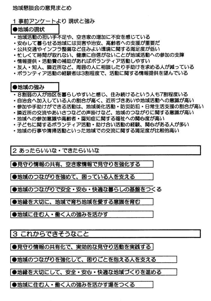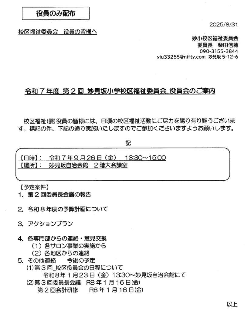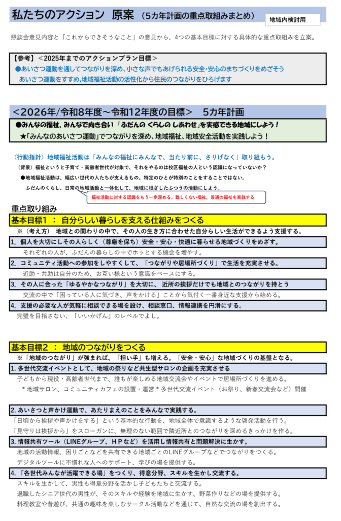 妙見坂小学校区福祉委員会 会報 令和7年9月1日 2025.09.022026.01.08 目次 第2回 校区福祉委員 役員会のご案内地域懇談会の意見まとめ私たちのアクションプラン(原案) 第2回 校区福祉委員 役員会のご案内 地域懇談会の意見まとめ 私たちのアクションプラン(原案)
