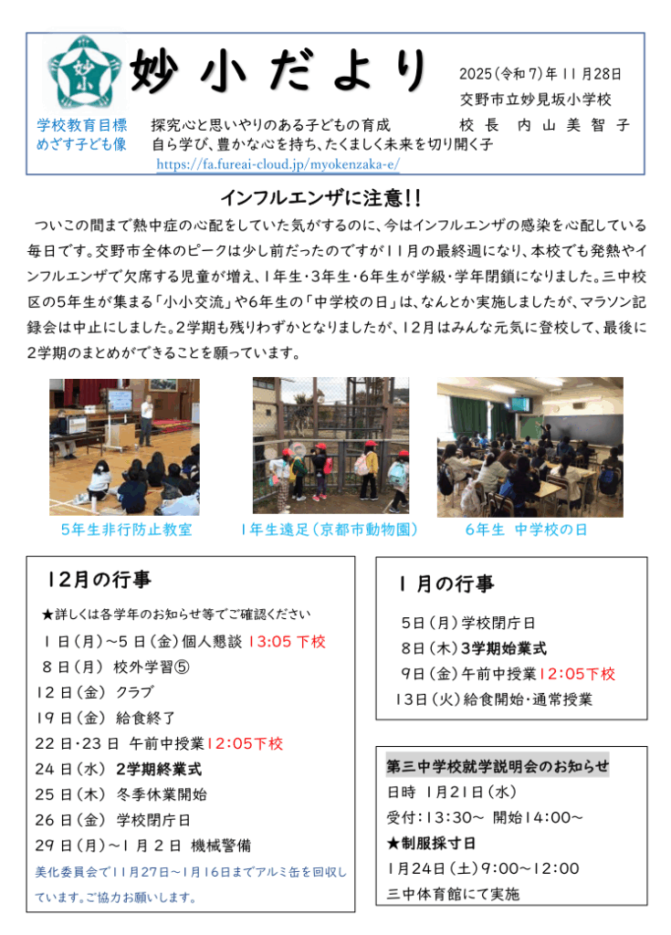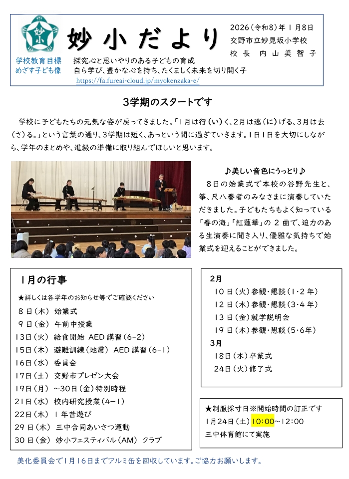 妙小だより 令和8年1月号 2026.01.132026.01.14 交野市立妙見坂小学校-トップページ 目次 妙小だより 令和8年1月妙小だより 令和7年12月妙小だより 令和7年11月妙小だより 令和7年10月号妙小だより 令和7年9月号妙小だより 令和7年7月号妙小だより 令和7年6月号妙小だより 令和7年5月号妙小だより 令和7年4月号 妙小だより 令和8年1月 妙小だより 令和7年12月 妙小だより 令和7年11月 妙小だより 令和7年10月号 妙小だより 令和7年9月号 妙小だより 令和7年7月号 妙小だより 令和7年6月号 妙小だより 令和7年5月号 妙小だより 令和7年4月号