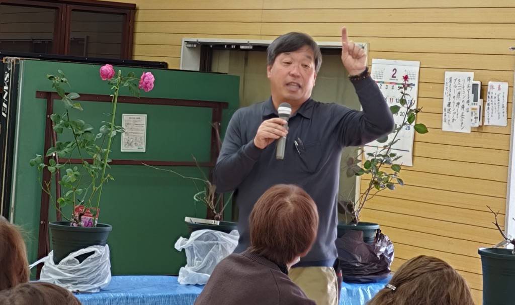 バラの剪定、施肥、植替、つるバラの育て方などを京阪園芸㈱の清水さんから教えて頂きました。(堀内)