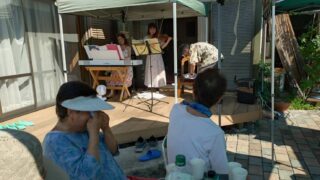 三丁目横山さんのフルート、梅田さんのバイオリン、堺から佐々木奈津子さんの電子ピアノの演奏です。 今日は暑い中、大変多くの方にご来場いただき、とても嬉しかったです。阿部さん宅の素敵なお庭で、音楽を通して地区住民が集まって楽しめたことは素晴らし...